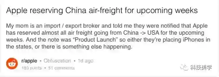 另外据Reddit用户爆料,苹果近期已经定下了未来数周几乎所有从中国飞往美国的货运航班,该用户称他妈妈是一个进口/出口经纪人,她透露称所有这些被苹果预定的货机还均贴上了“产品发布”(Product Launch)的字样。