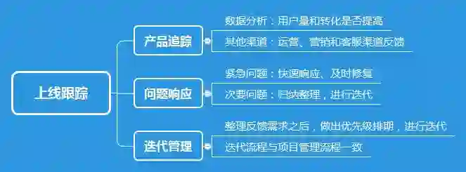 产品上线后,需要进行产品跟踪,以验证产品效果及待优化的功能点,同时应对上线之后可能遇到的问题,主要内容包括: