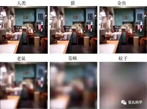 人眼中的世界和动物眼中的世界有何不同?杜克大学的一项研究告诉我们,大多数动物眼中的世界可能都比较模糊。比如下面这张就是几种常见生物,在不考虑色彩因素下的视力模拟图像: