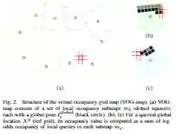 图2 虚拟占据栅格图(VOG-map)的结构。(a)VOG-map由一组局部占据子图mi(点阵)组成,每个子图具有全局偏序集全局i(黑圈)。(b),(c)对于查询的全局位置Xg(红色网格),其占用值被计算为每个子图中局部查询的对数奇数占用的总和。