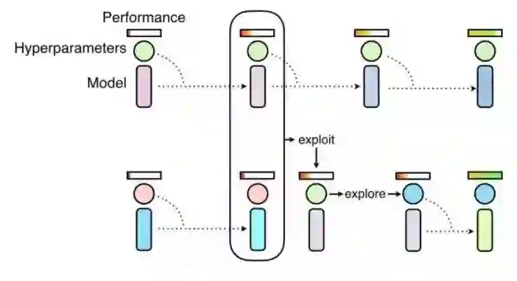 基于种群的训练示意图,它通过训练一个神经网路的种群来探索超参数计划。它将随机搜索(探索)和拷贝高性能个体的模型权重(利用)结合起来(https://deepmind.com/blog/population-based-training-neural-networks/)。