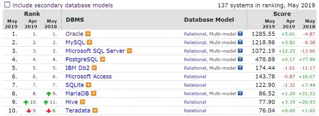 DB-Engines 数据库流行度排行榜发布了 5 月份的数据,排名前二十如下: