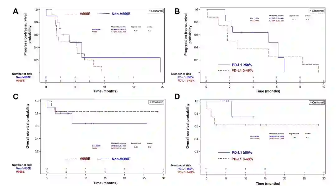 值得注意的是,研究中BRAF V600E 及PD-L1 ≥ 50%共存的这部分患者,ICPi 及靶向治疗的结果对于一线治疗规划是非常重要的。结果显示,BRAF抑制剂联合MEK抑制剂的效果更好,而ICPi治疗的6例患者中有2例出现了超进展。鉴于病例数较少,关于靶向治疗与ICPi的优劣还需要进一步的数据确认。