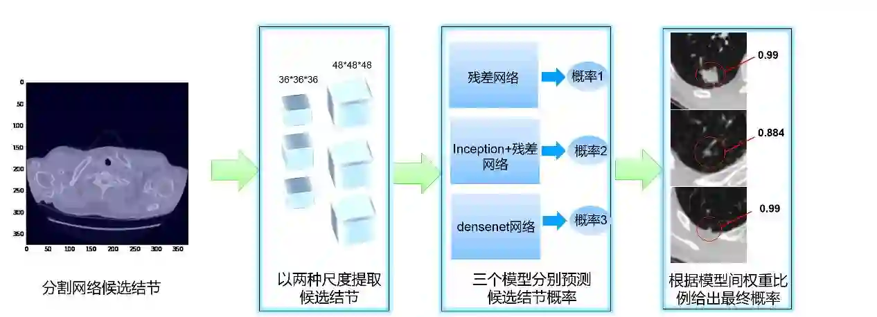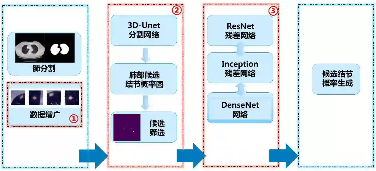 团队利用计算机视觉领域卷积神经网络技术来解决肺结节检测问题,并在多个层面上进行创新。1)结合物体检测与分割算法提取候选结节,产生高召回率候选结节池。2)使用假阳性衰减网络,并采取多尺度集成学习的网络模型提高检测精度,衰减假阳性比例。3)在数据的处理上,采取生成对抗网络进行了数据增广,提高了训练的有效性。