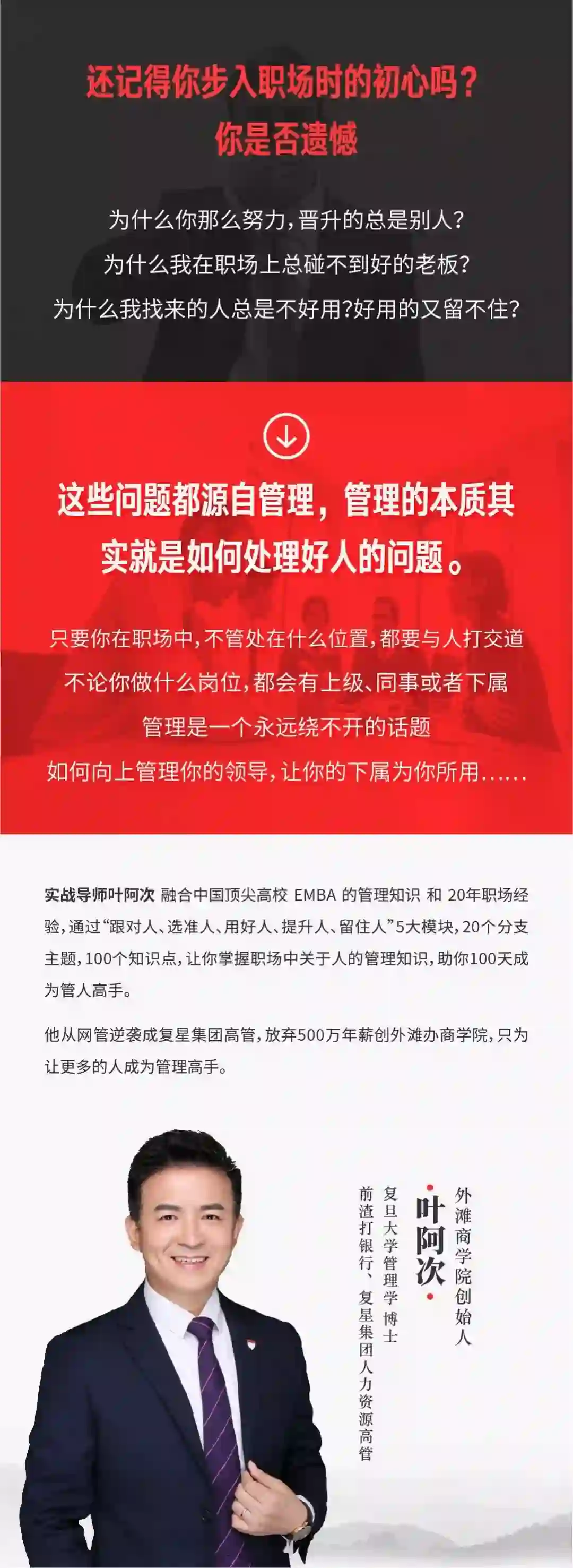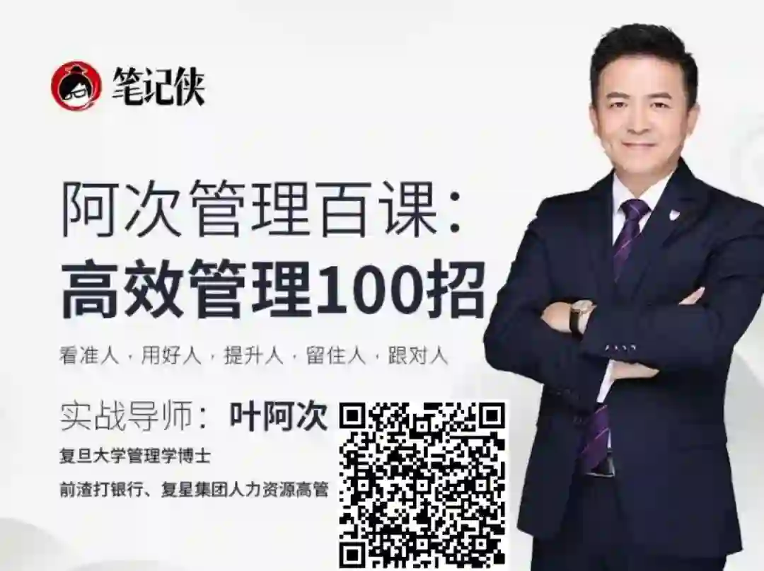 这里有一档课程《阿次的管理百课:高效管理100招》,由复星集团人力资源高管叶阿次老师带您探寻管理的本质,帮助您快速晋升,突破管理瓶颈,成为管人高手。