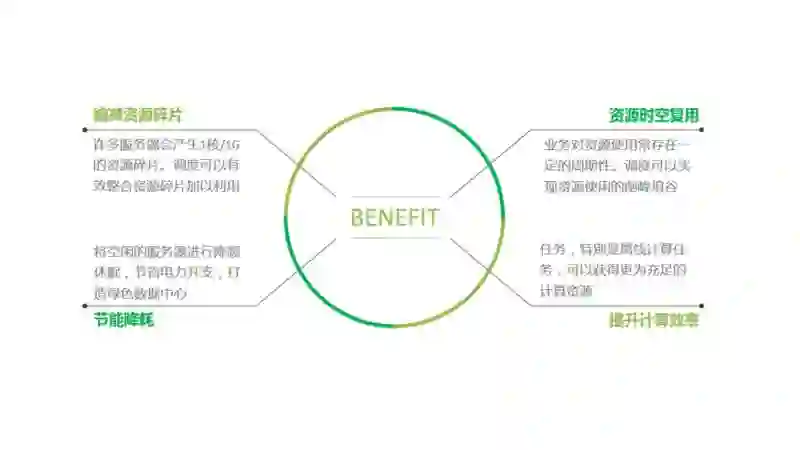 调度的意义从微观上来说,是为每个容器寻找到一个合适的落脚点,也就是节点。但是从宏观角度来说,其意义在于将整个数据中心计算效能的提升。具体来说,调度可以在缩减资源碎片,资源时空复用,节能降耗以及提升计算效率方面取得巨大收益。而且该收益随着集群规模的扩大,会有更为明显的提升。