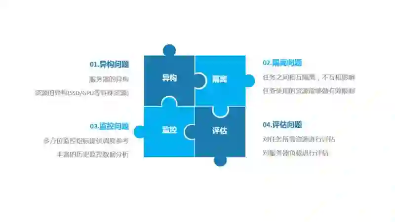 调度虽然收益颇丰,但是要实现也非轻而易举。调度不是空中楼阁,它依赖于大量的基础工作。这其中一些典型的问题,需要一一解决,比如异构、隔离、监控、评估等问题。