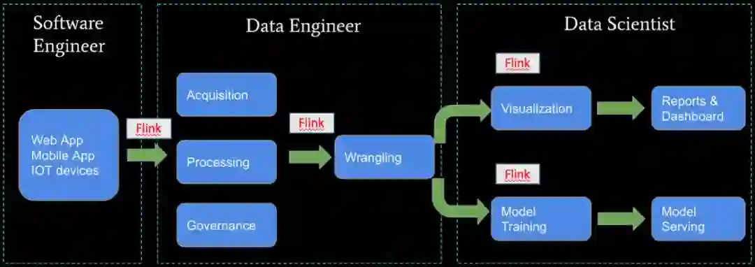 我们首先来看下这张大数据场景图。这张图基本上把你日常需要处理的大数据场景都包括进来。从最左边的数据生产者,到数据收集,数据处理,然后再到数据应用 ( BI + AI )。你会发现 Flink 可以应用在每一个步骤。不仅涉及到大数据,也涉及到 AI,所以说学习 Flink 等于学到了大数据 + AI 全栈。