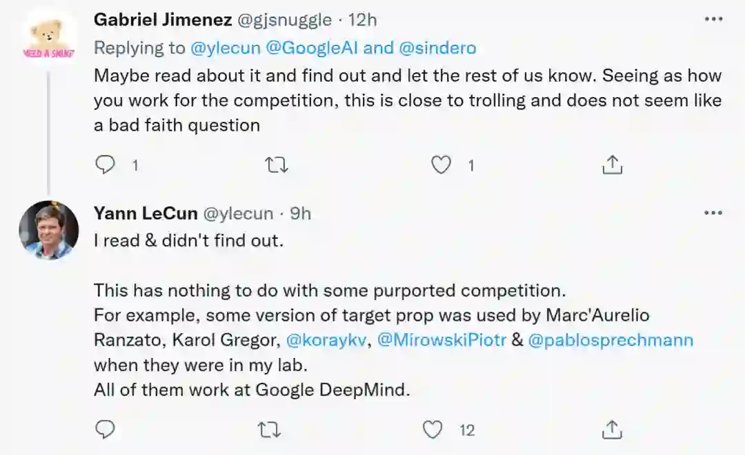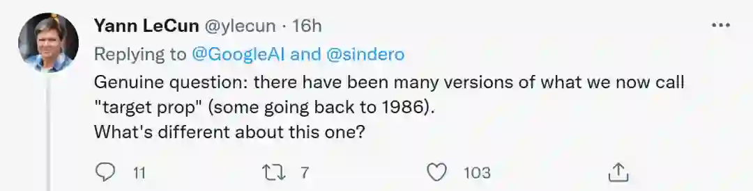 不过,有人对 LeCun「不感冒」,认为他是出于竞争的考虑提出疑问,甚至「引战」。LeCun 对此进行了回复,声称自已的疑问无关竞争,并举例自己实验室的前成员Marc'Aurelio Ranzato、Karol Gregor、koray kavukcuoglu等都曾使用过一些版本的目标传播,如今他们都在谷歌DeepMind工作。