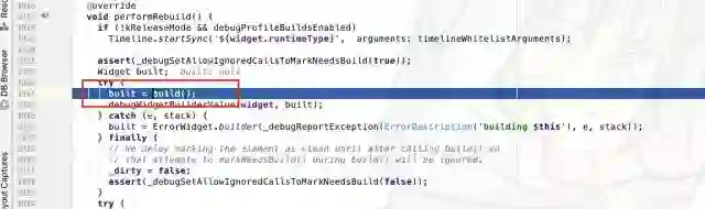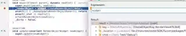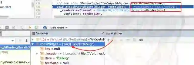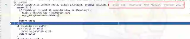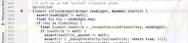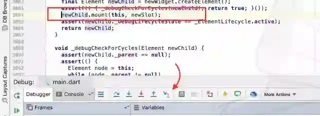 点击这个,当前断点就会被放行,程序继续运行,当运行到下一个断点时就会停下,也就是 inflateWidget 处,这样就可以避免调试中间的流程。当你在调试时,可以先选一些肯出错的地方,打上断点,然后再去调试。这样能更迅速的定位到 bug 所在。