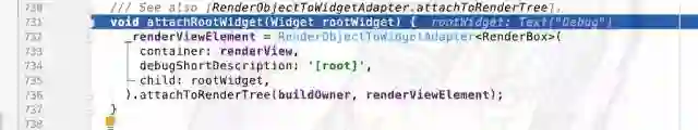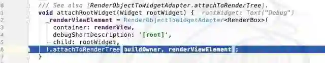 这里通过 RenderObjectToWidgetAdapter 对象的 attachToRenderTree 方法为 _renderViewElement 进行赋值。这里小蓝下一步会走到哪?