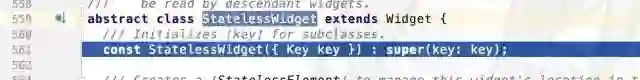 由于 Text 继承自 StatelessWidget,super 方法调用父类。故进入: StatelessWidget 构造