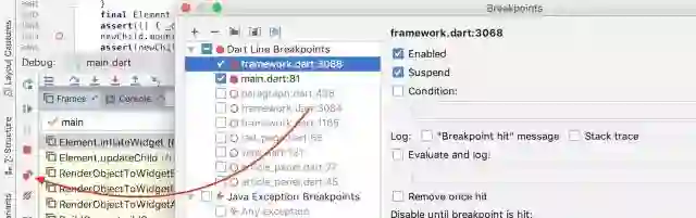 比如在 inflateWidget 这里再打个断点,运行时,首先会停留在第一个断点 mian 那里。
