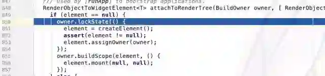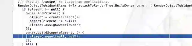这样 RenderObjectToWidgetAdapter(Widget) 就被 RenderObjectToWidgetElement(Element) 纳为己有,元素也被成功创建,小蓝继续来到这里刚才创建元素的方法中。走几步便到达 owner.buildScope 方法,将刚才的元素传入,并在回调中执行元素的装载方法 (mount) 这是顶层元素的装配点,记住它被触发的时机,划重点,要考的。