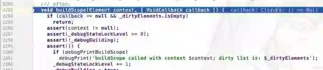 这里提问: 小蓝在此时会走到哪? 我好像听到有人说是先执行第二个入参里的方法,因为它可执行。答案是进入 buildScope,因为第二参只是一个函数类型的入参,并没有被触发。于是到达了 buildScope,这个Flutter框架核心环节之一: