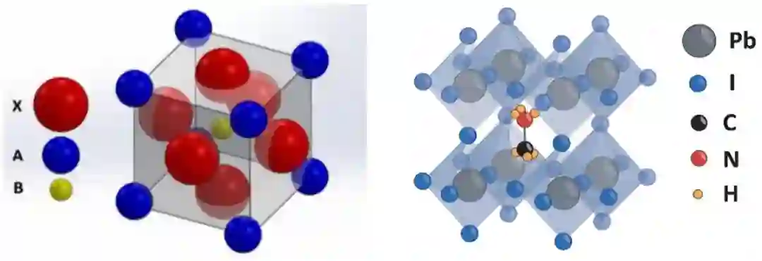 图4. 钙钛矿结构示意图。左边是一般结构示意图,右边是有机无机杂化结构示意图。