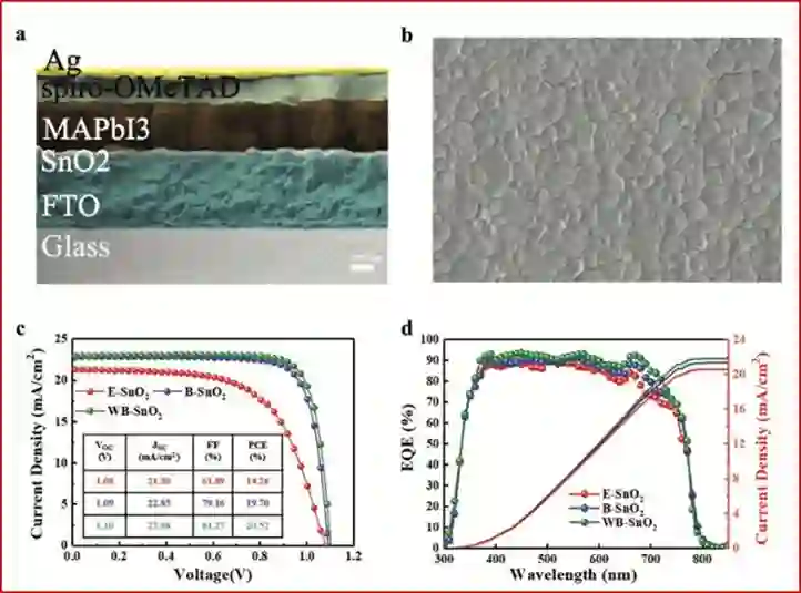 图6. 低温SnO2 电子输运层可显著提升钙钛矿电池性能。
