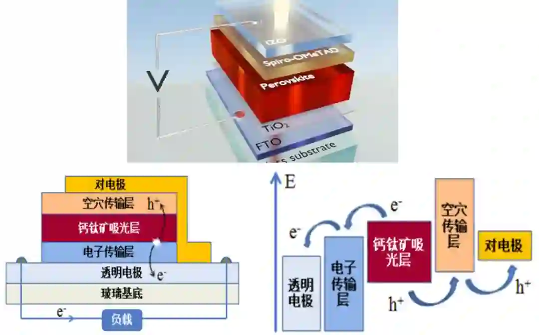 杂化钙钛矿太阳能电池的基本结构如图5所示,包括钙钛矿光吸收层、电子传输层、空穴传输层、工作电极等。我们看到了,除了这个钙钛矿光吸收层,太阳能电池要工作起来,还需要这些传输层、电极等配合。这就是本文标题的起源:打着钙钛矿这个好汉的旗号,叙述“三个帮”的故事。