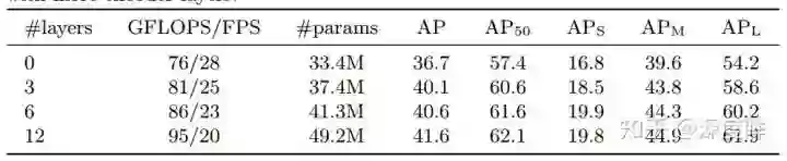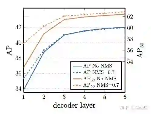 可以发现解码器也是越多越好,还可以观察到第一个解码器输出预测效果比较差,增加第二个解码器后性能提升非常多。上图中的NMS操作是指既然我们每个解码层都可以输入无序集合,那么将所有解码器无序集合全部保留,然后进行nms得到最终输出,可以发现性能稍微有提升,特别是AP50。