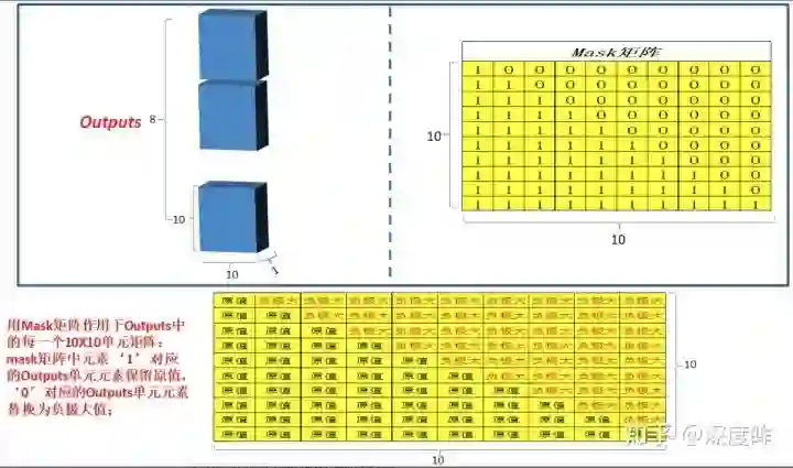 先忽略Mask的作用,左边是单头attention操作,右边是n个单头attention构成的多头自注意力层。