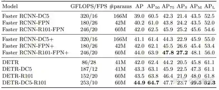 Faster RCNN-DC5是指的resnet的最后一个stage采用空洞率=stride设置代替stride,目的是在不进行下采样基础上扩大感受野,输出特征图分辨率保持不变。+号代表采用了额外的技巧提升性能例如giou、多尺度训练和9xepoch训练策略。可以发现detr效果稍微好于faster rcnn各种版本,证明了视觉transformer的潜力。但是可以发现其小物体检测能力远远低于faster rcnn,这是一个比较大的弊端。