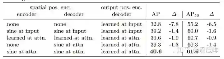 作者对比了不同类型的位置编码效果,因为query_embed(output pos)是必不可少的,所以该列没有进行对比实验,始终都有,最后一行效果最好,所以作者采用的就是该方案,sine at attn表示每个注意力层都加入了sine位置编码,相比仅仅在input增加位置编码效果更好。
