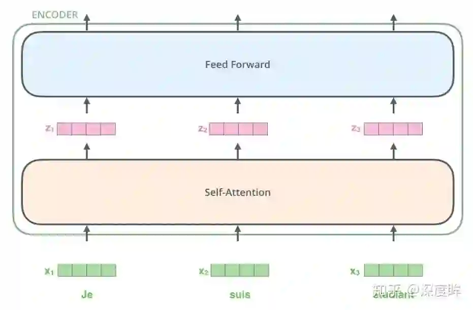 这个计算很明显就是前面说的注意力机制计算过程,每个输入单词的编码输出都会通过注意力机制引入其余单词的编码信息。