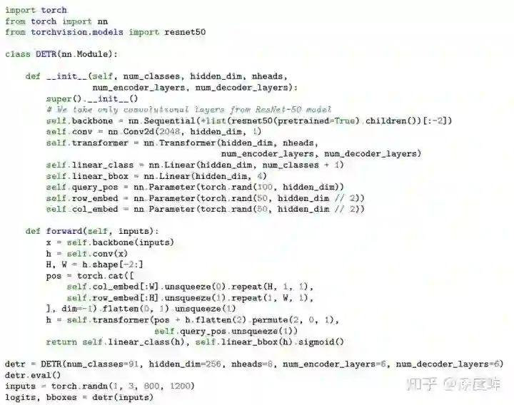 基于transformer的detr算法,作者特意强调其突出优点是部署代码不超过50行,简单至极。