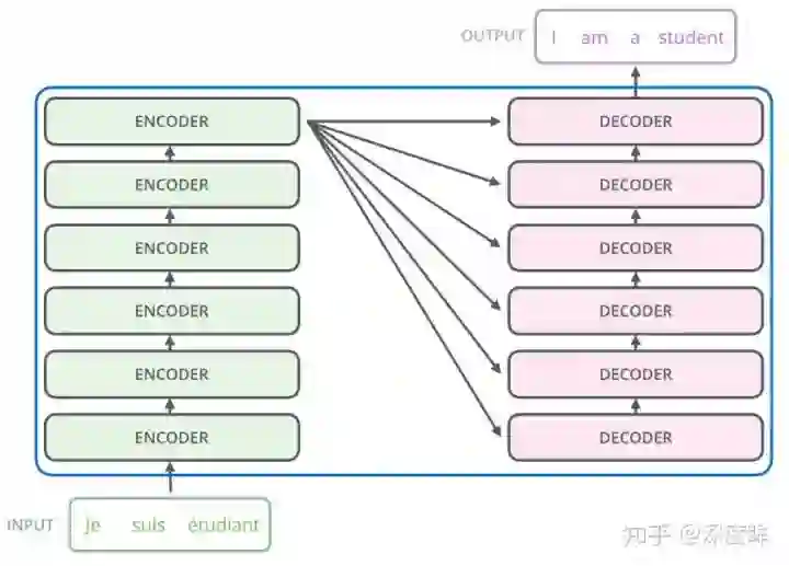 其包括6个结构完全相同的编码器,和6个结构完全相同的解码器,其中每个编码器和解码器设计思想完全相同,只不过由于任务不同而有些许区别,整体详细结构如下所示:
