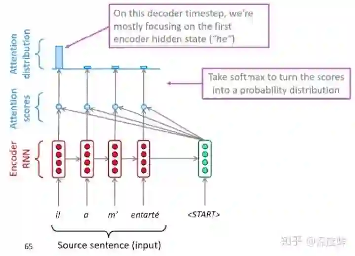 在没有attention时候,不同解码阶段都仅仅利用了同一个编码层的最后一个隐含输出,加入attention后可以通过在每个解码时间步输入的都是不同的上下文向量,以上图为例,解码阶段会将第一个开启解码标志<START>(也就是Q)与编码器的每一个时间步的隐含状态(一系列Key和Value)进行点乘计算相似性得到每一时间步的相似性分数,然后通过softmax转化为概率分布,然后将概率分布和对应位置向量进行加权求和得到新的上下文向量,最后输入解码器中进行解码输出,其详细解码可视化如下: