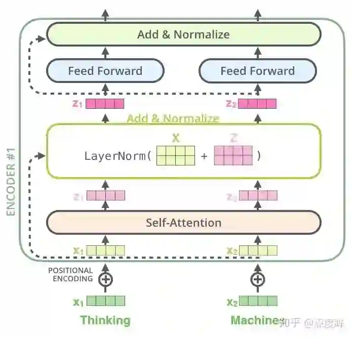 注意上图没有绘制出单词嵌入向量和位置编码向量相加过程,但是是存在的。