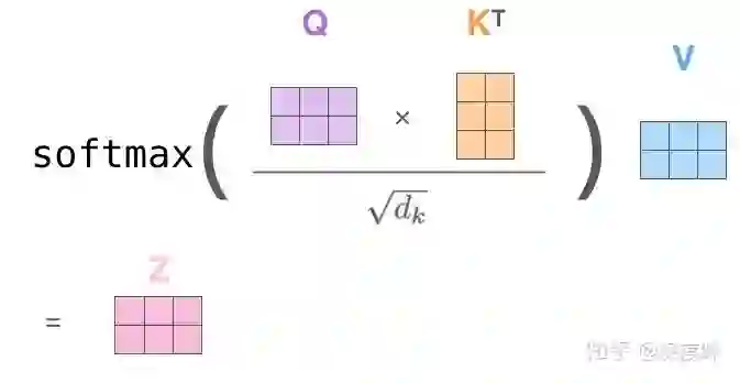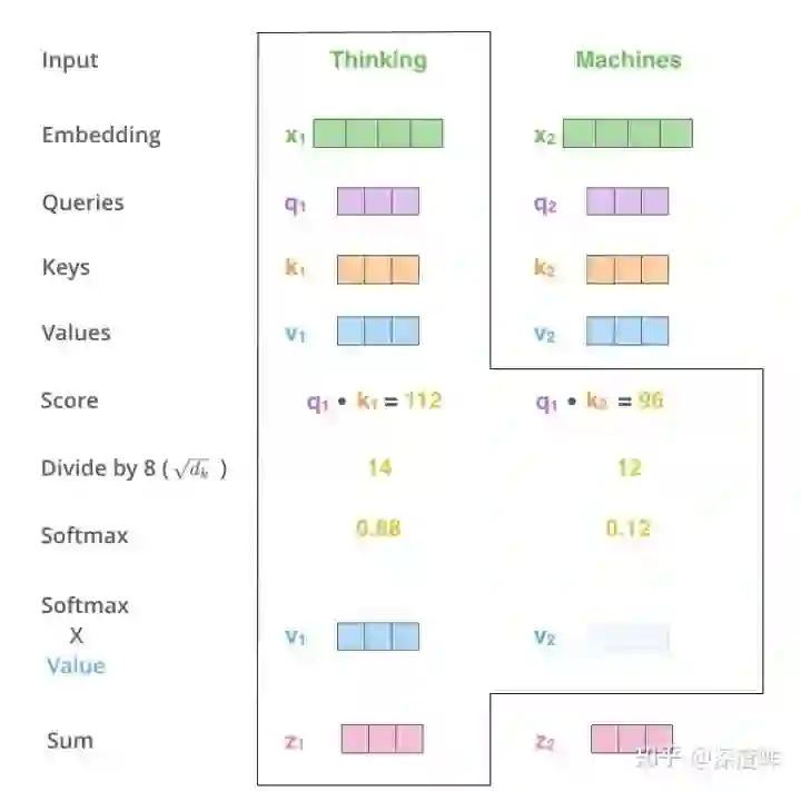 上述绘制的不是矩阵形式,更好理解而已。对于第一个单词的编码过程是:将q1和所有的k进行相似性计算,然后除以维度的平方根(论文中是64,本文可以认为是512)使得梯度更加稳定,然后通过softmax传递结果,这个softmax分数决定了每个单词对编码当下位置(“Thinking”)的贡献,最后对加权值向量求和得到z1。