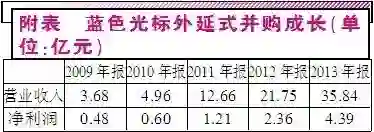 蓝色光标是一个赚差价的公司,它用资本市场的高PE溢价募集而来的钱去低价收购公关行业内的同行,然后再到资本市场变现。换句话说,在证券市场用最高110倍的PE 募资然后在线下花10倍PE买未上市公司(例如SNK),仅仅4年时间,公司营收就从上市前的3.68亿元跃升到2013年的35.84亿,业绩增长近10倍;利润也从4845万跳升到4.39亿,上涨9.15倍。在公司2012年2.36亿的盈利中,一半来自并购。3~4年的时间公司股价从7.49元涨到最高68.79元(复权),上涨了8倍,以今天(2014/5/4)51.88块钱算也增长了6.9倍,这就是将并购的增长发挥到了极致。