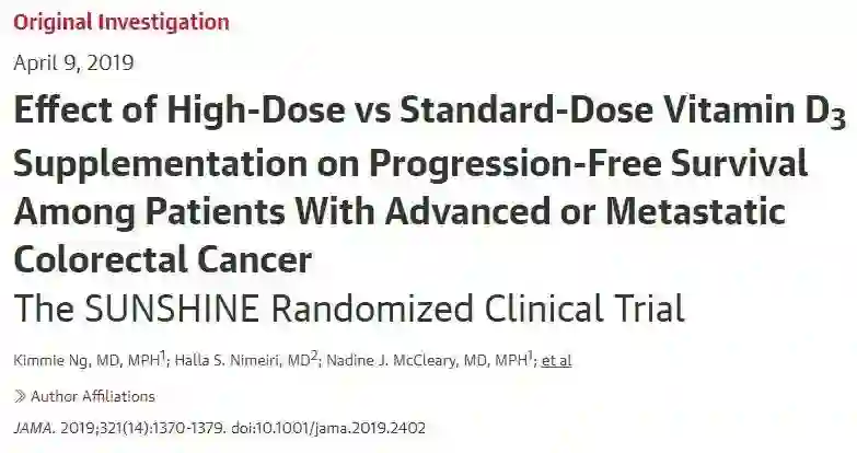 SUNSHINE试验对139名过去未接受治疗的转移性结直肠癌患者进行随机分组。一组患者在接受标准化疗的同时每天服用4000国际单位(IU)的维生素D,而另一组在接受化疗的同时每天服用400国际单位(IU)的维生素D。