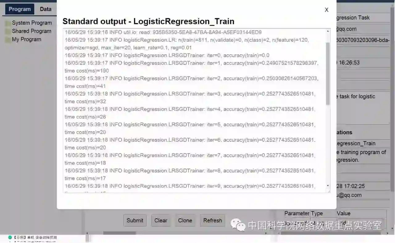 大数据分析研究组开源了Easy Machine Learning系统,其通过交互式图形化界面让机器学习应用开发变得简单快捷,系统集成了数据处理、模型训练、性能评估、结果复用、任务克隆、ETL等多种功能,此外系统中还提供了丰富的应用案例以及基于Docker的分布式运行环境,欢迎大家下载试用。