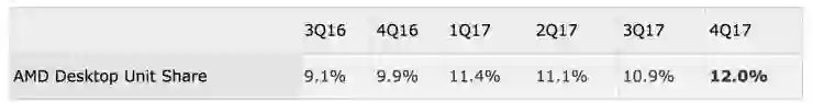 我们知道,AMD 长期以来在 CPU 领域一直被英特尔压着打,市场份额更是遥遥落后。不过,据雷锋网(公众号:雷锋网)了解,随着去年正式发布 Ryzen 系列处理器,这一情况有了很大的改观。