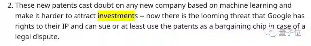 这样的专利,对任何年轻的机器学习公司都会有影响,让他们更难吸引到投资——现在谷歌对许多算法已经有知识产权了,(如果使用专利代码) 随时可能被起诉。