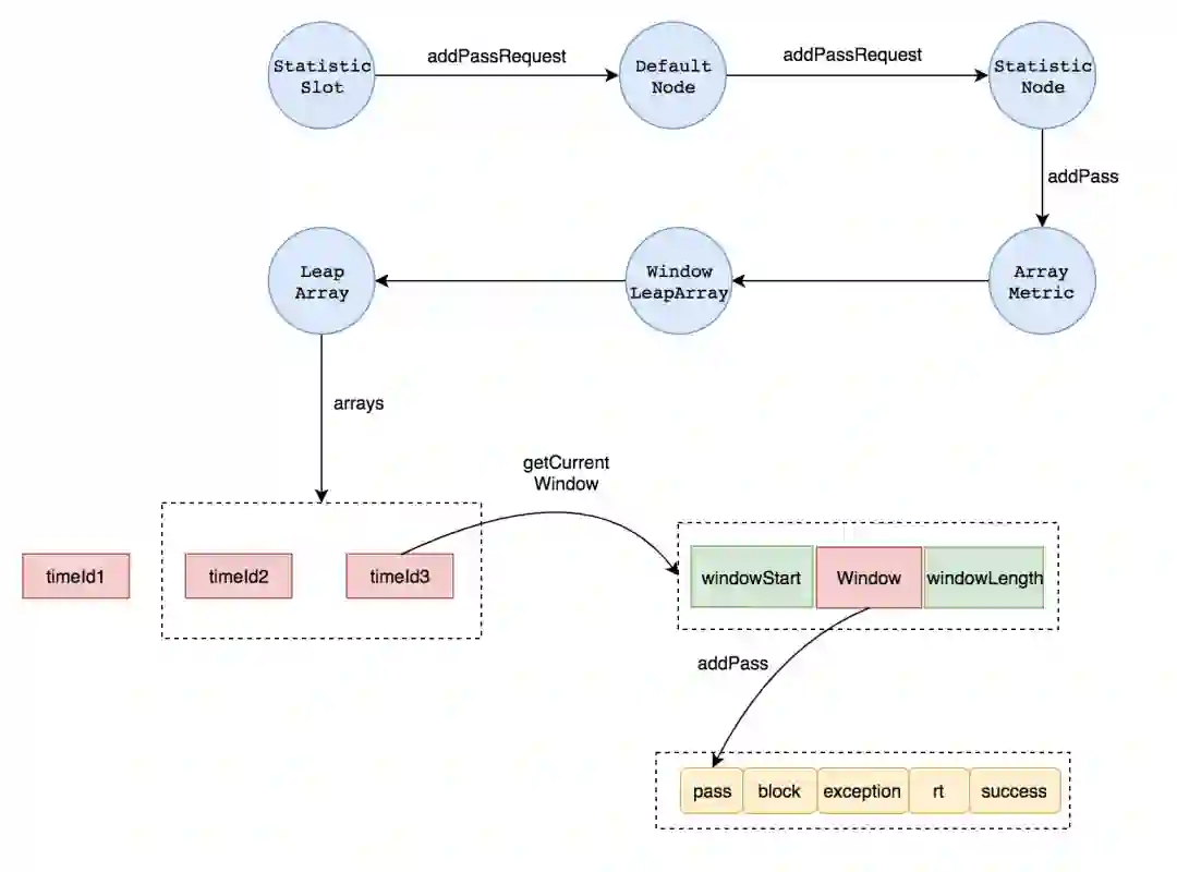 value:滑动窗口记录的内容,泛型表示,关键的一类就是 MetricBucket,里面包含了一组 LongAdder 用于记录不同类型的数据,例如请求通过数、请求阻塞数、请求异常数等等。
