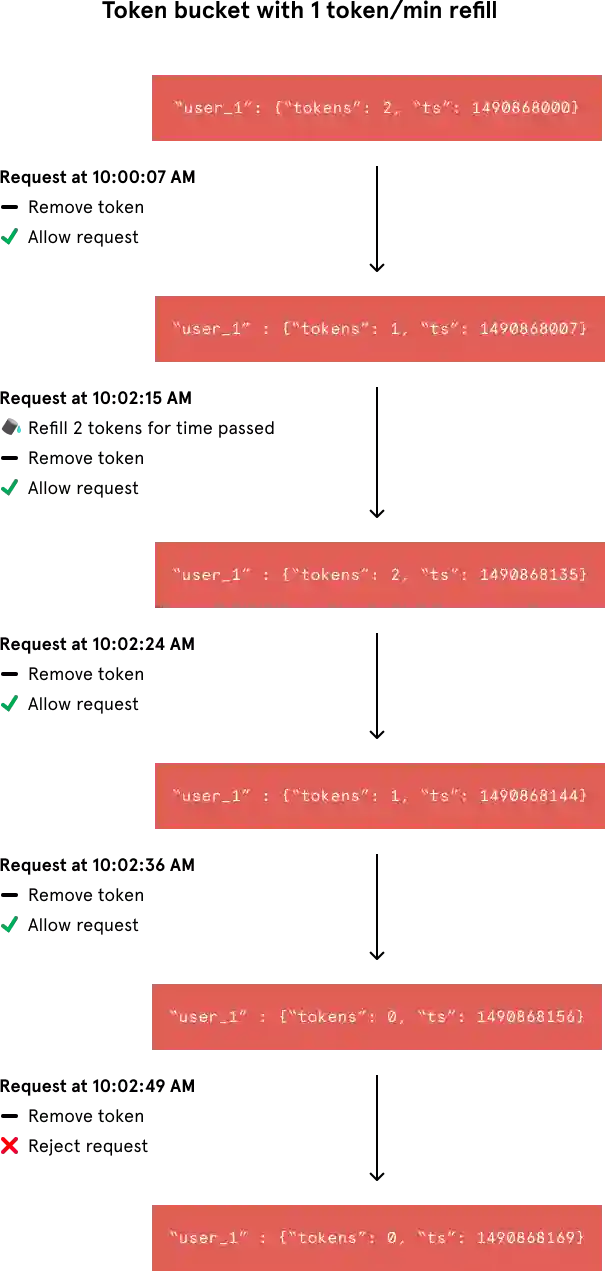 local tokens_key = KEYS[1]local timestamp_key = KEYS[2]local rate = tonumber(ARGV[1])local capacity = tonumber(ARGV[2])local now = tonumber(ARGV[3])local requested = tonumber(ARGV[4])local fill_time = capacity/ratelocal ttl = math.floor(fill_time*2)local last_tokens = tonumber(redis.call("get", tokens_key))if last_tokens == nil thenlast_tokens = capacityendlocal last_refreshed = tonumber(redis.call("get", timestamp_key))if last_refreshed == nil thenlast_refreshed = 0endlocal delta = math.max(0, now-last_refreshed)local filled_tokens = math.min(capacity, last_tokens+(delta*rate))local allowed = filled_tokens >= requestedlocal new_tokens = filled_tokensif allowed thennew_tokens = filled_tokens - requestedendredis.call("setex", tokens_key, ttl, new_tokens)redis.call("setex", timestamp_key, ttl, now)return { allowed, new_tokens }