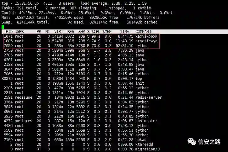 某天,网站管理员发现服务器 CPU 资源异常,几个异常进程占用大量网络带宽: