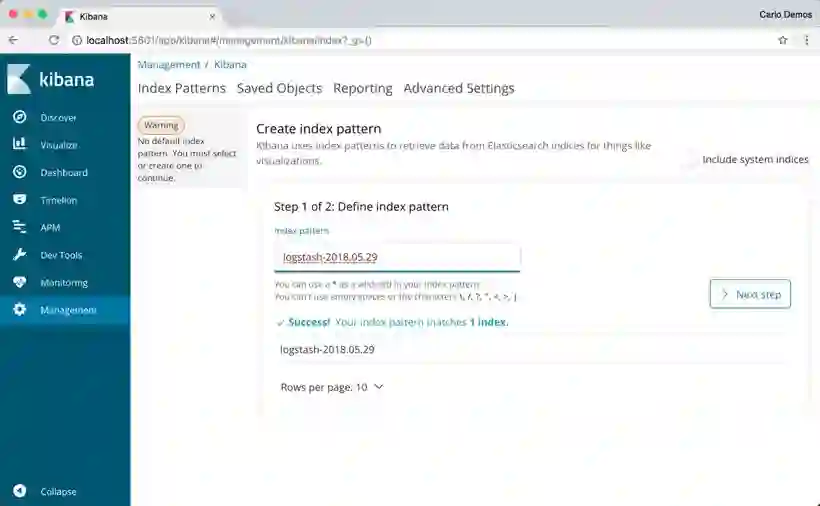 Kibana 现在还不会显示任何日志。您必须先指定索引才能查看记录的数据。为此,请单击导航中的 Management 链接,然后将列在页面底部的 logstash 索引名称复制到文本框中,如下所示,然后单击下一步按钮。或者,您可以使用*号通配符,例如 logstash-*
