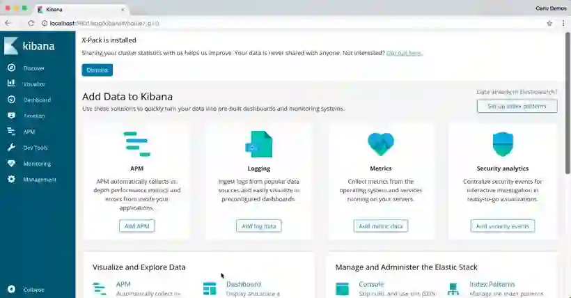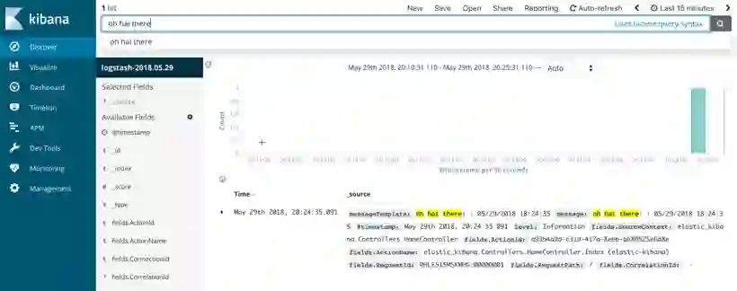 只需启动包含 ElasticSearch 和 Kibana 容器的 docker compose 文件,您就可以开始记录和搜索了。