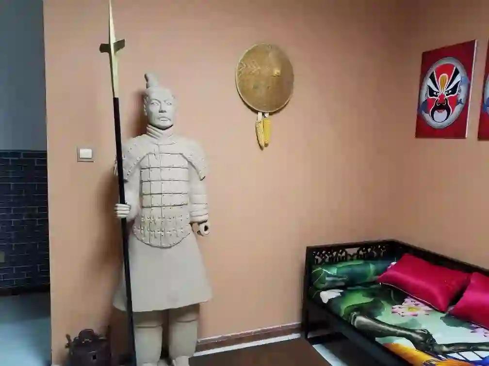 因此门厅转角里藏着一个兵马俑,阳台上扔着号称是光绪年间的洗脸盆,上面还架着一把卧虎藏龙青冥宝剑——不用问,都是网上淘的好宝贝。
