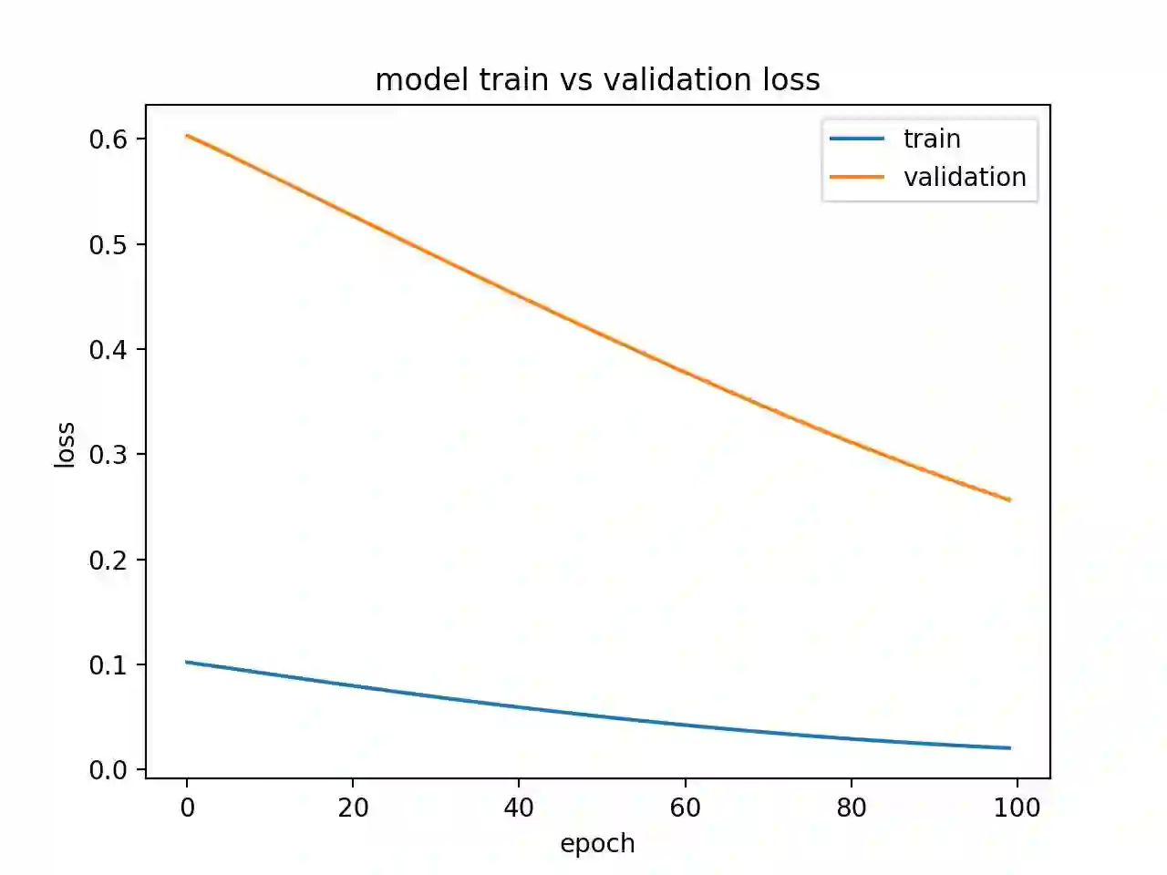 运行这个实例会产生一个训练损失和验证损失图,该图显示欠拟合模型特点。在这个案例中,模型性能可能随着训练 epoch 的增加而有所改善。