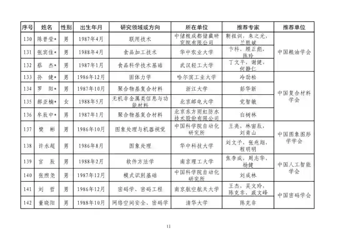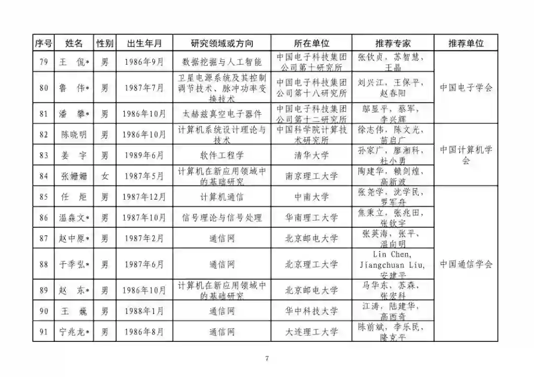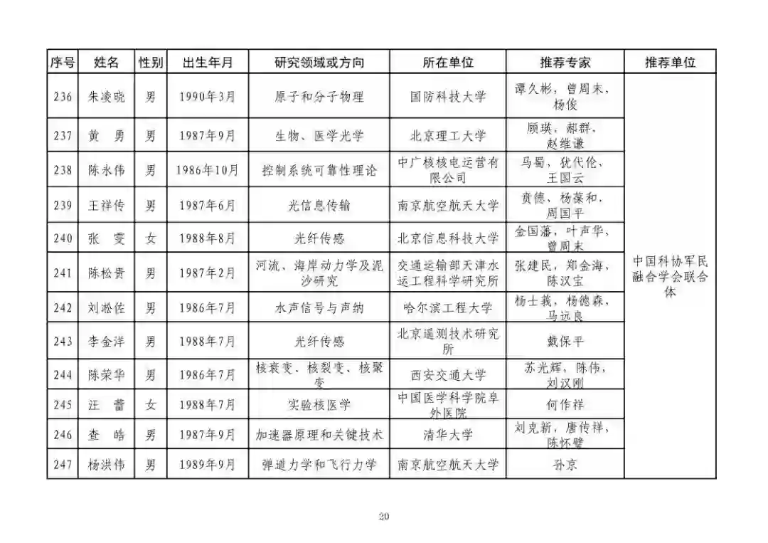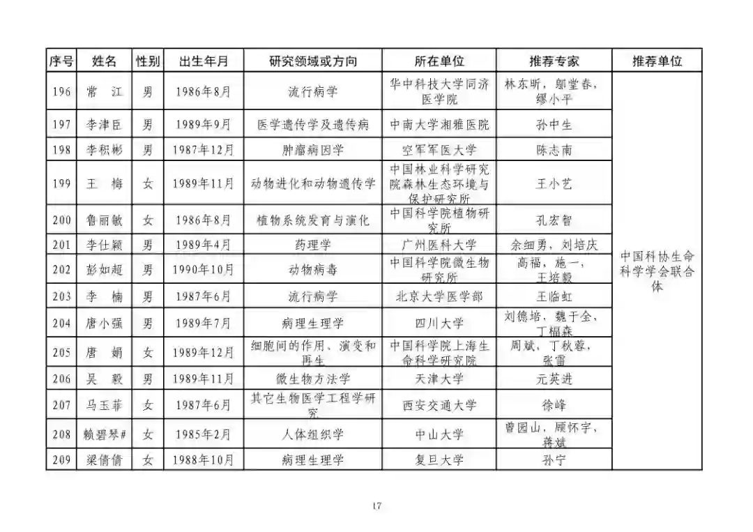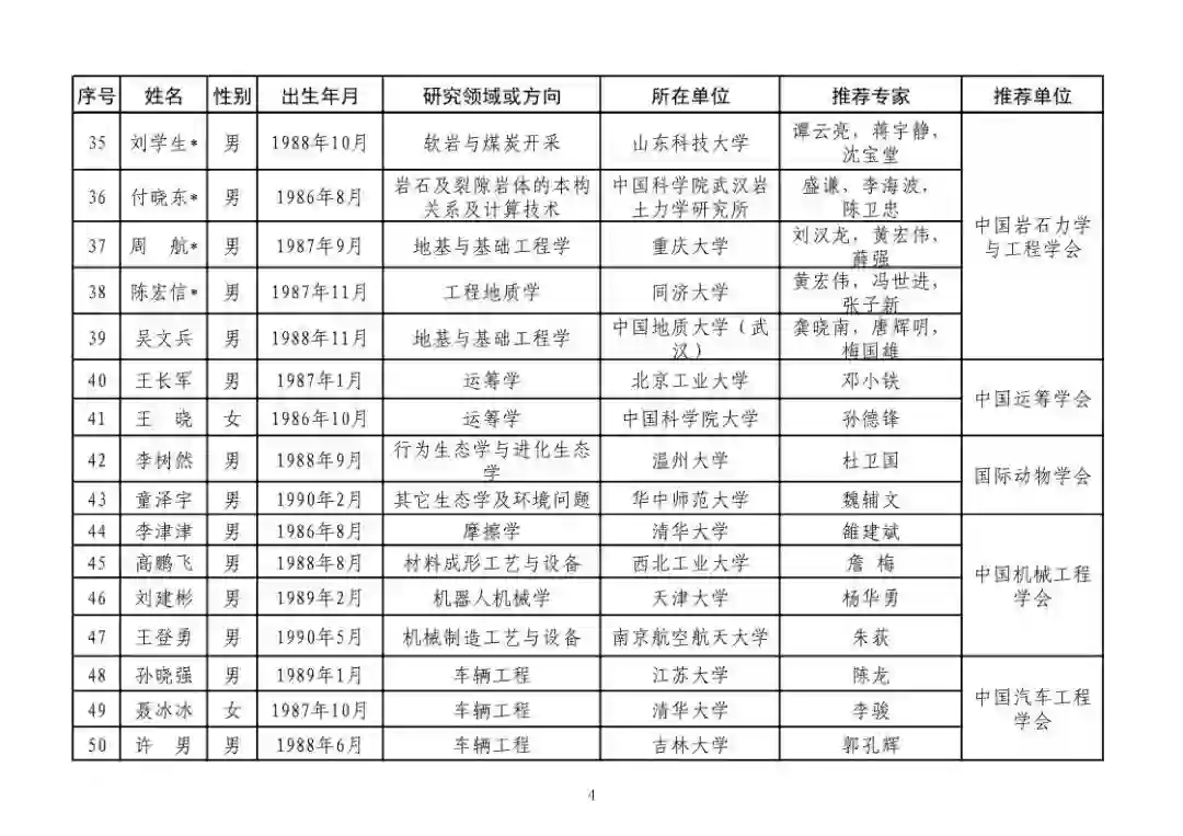 第四届中国科协青年人才托举工程人选名单