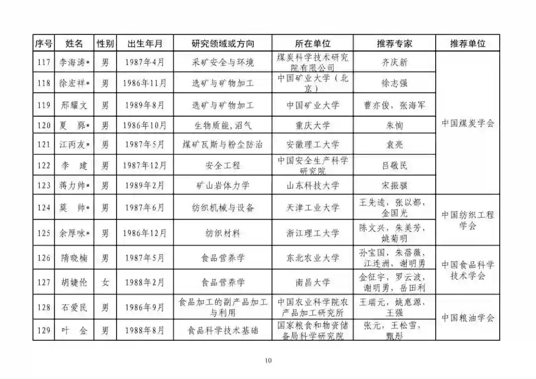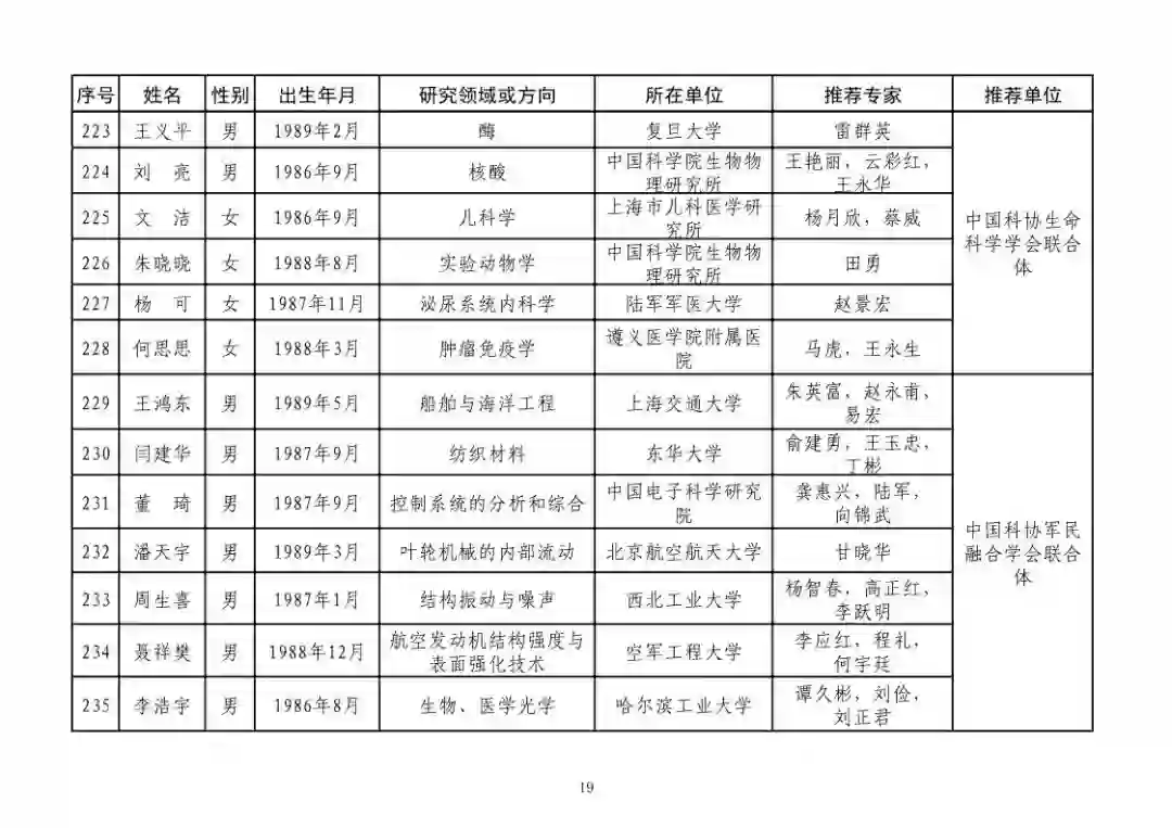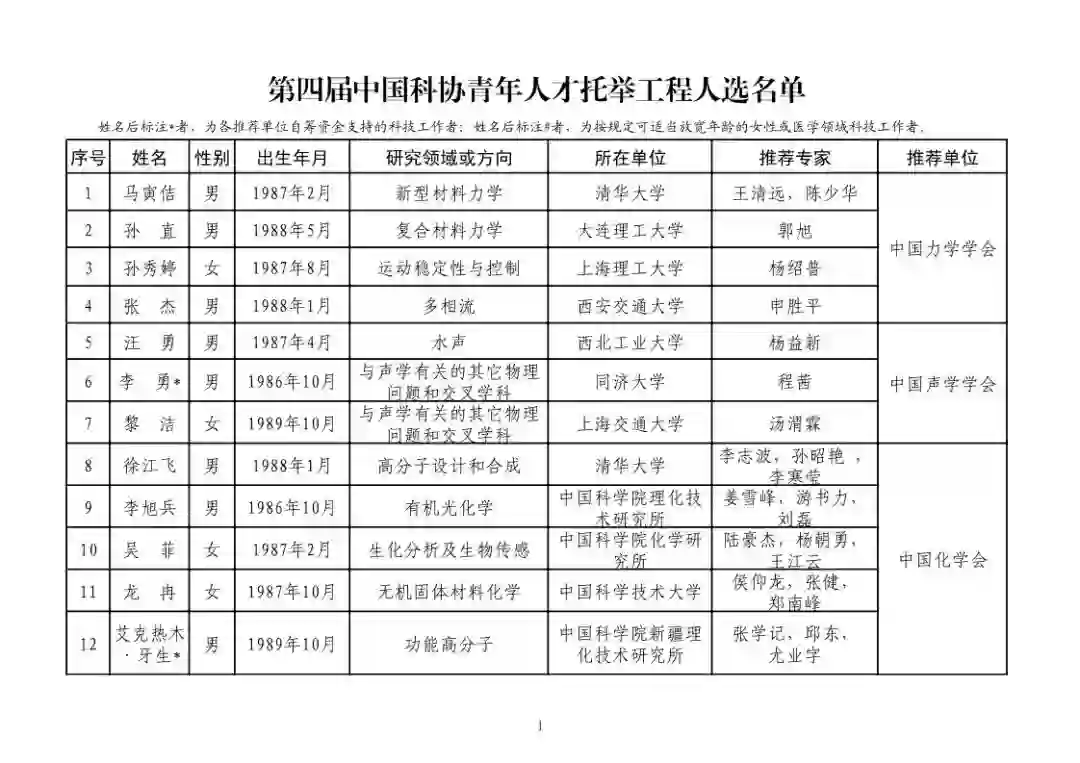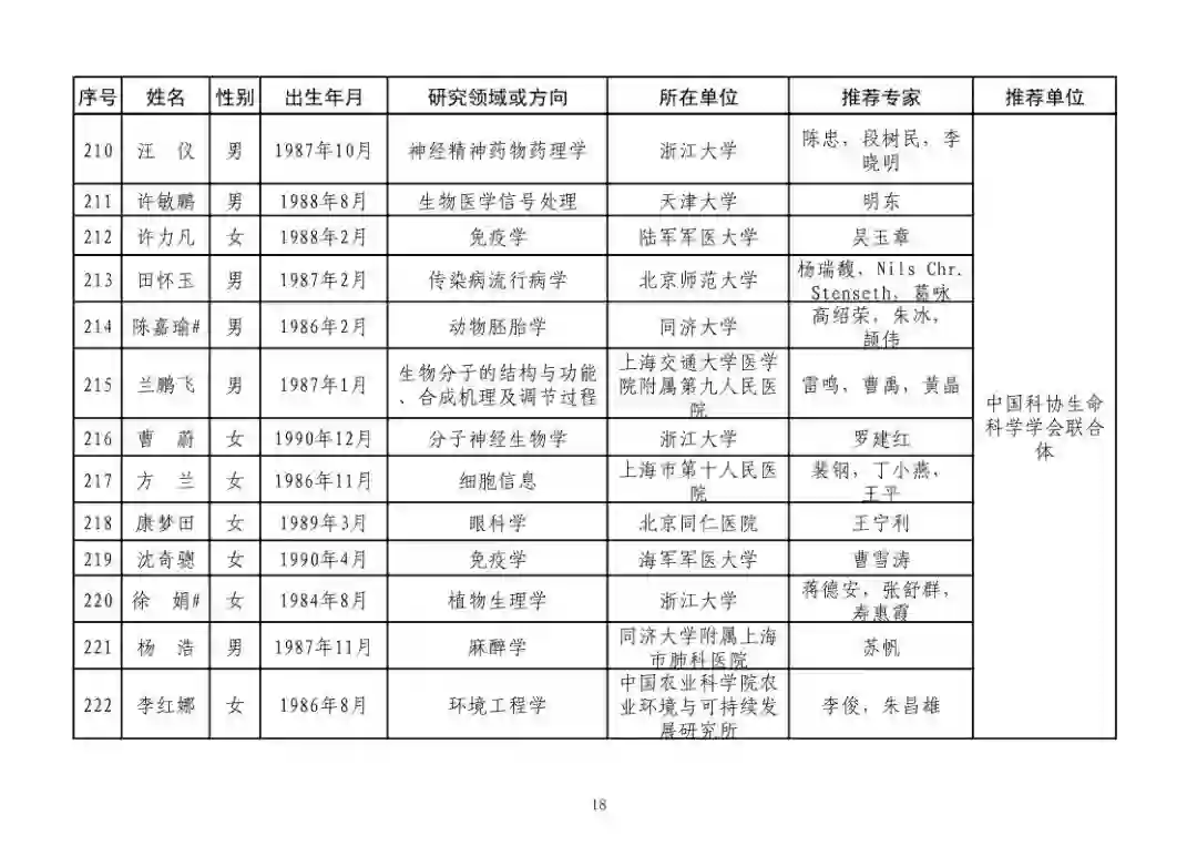 第四届中国科协青年人才托举工程人选名单公示