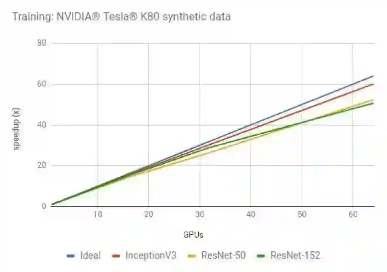 因此由于通信成本或并行策略等限制,加速比并不是成线性增长的,以下是 TensorFlow 中的多 GPU 基准的加速情况,ResNet 使用 60 块 GPU 相当于提供了 50 倍的加速。