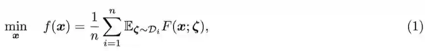 其中 x 表示模型参数,F 表示给定 x 和批量数据 ζ 下的损失函数。因为整个更新过程有 n 个计算节点参加,那么每一个节点的每一个批量数据都应该从对应的局部分布 D_i 中采样。如果需要更新参数 x,那么使用下式求得的梯度来更新就行了: