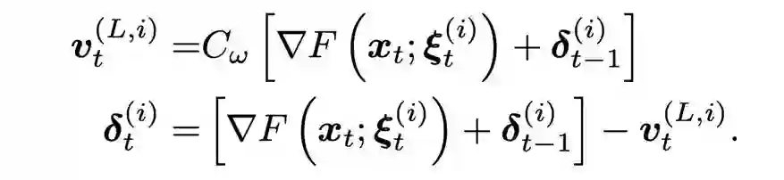 其中 g^i 表示各节点的局部梯度,g 也就是参数服务器求得的全局梯度。这里在将 g^i 传递到参数服务器时,我们可以用稀疏化或量化等压缩方式进行处理,即表示为 C[g^i]。但是在压缩梯度后,它肯定会丢失一些信息,对收敛性以及收敛效率都会产生影响。